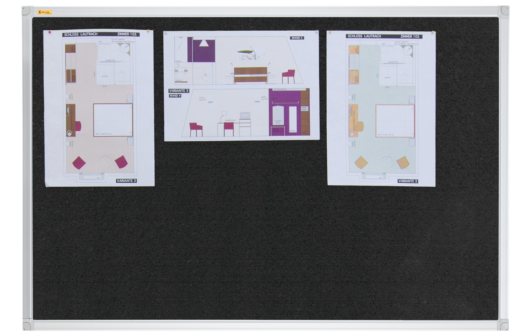• Felt Notice Board valueline • Sizes: 60 x 45cm, 90 x 60cm, or 180 x 90 cm • Black • Economic notice boards for any office • Fix your memos, photos, etc. with push-pins • Silver anodised aluminium frame • Includes mounting kit (standard fixings or hidden through corners) • Can be displayed portrait or landscape