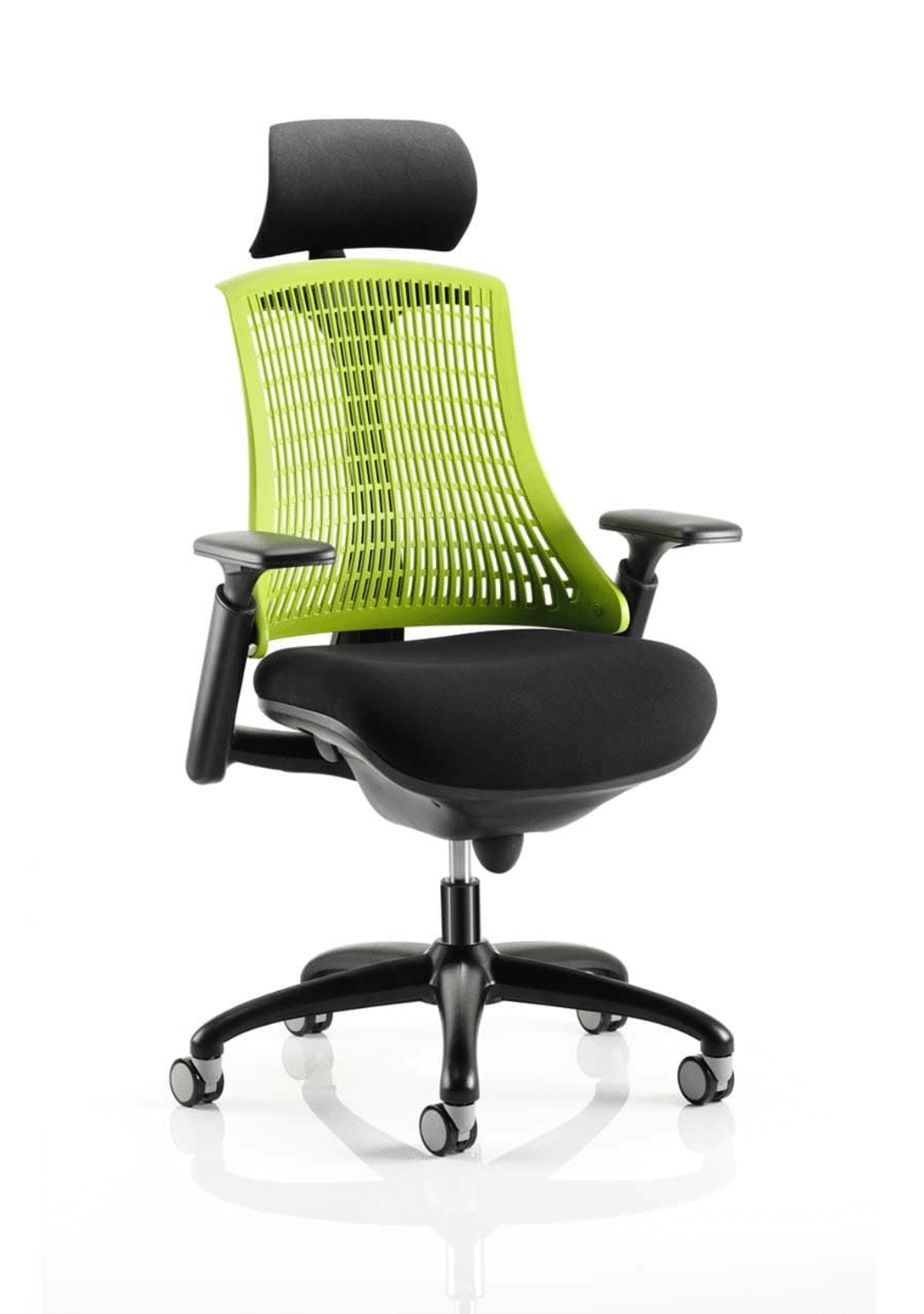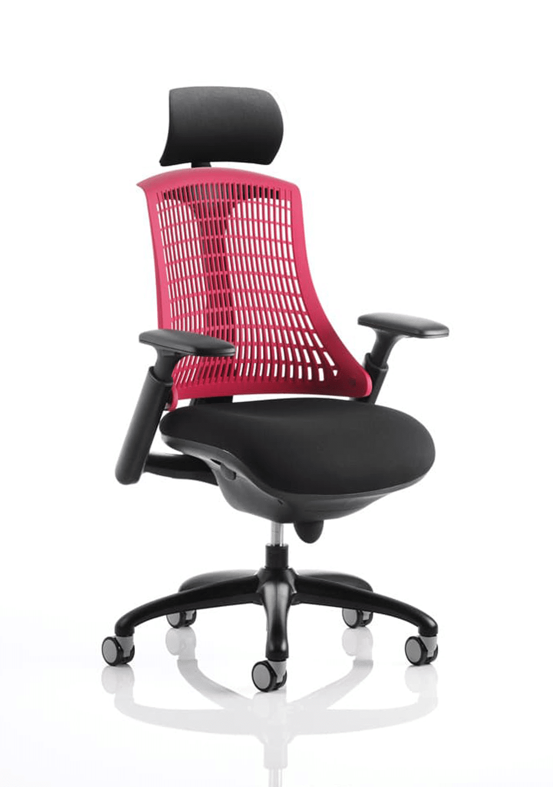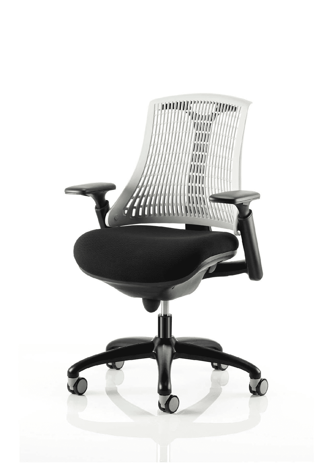 • Available with white or black finish • Backrest available in variety of colours • Stylish modern design • Large cushioned seat • Synchro tilt mechanism • Flexible back for optimum user comfort • Height adjustable gel padded arms • Matching nylon 5 star base and arms • Optional fixed headrest