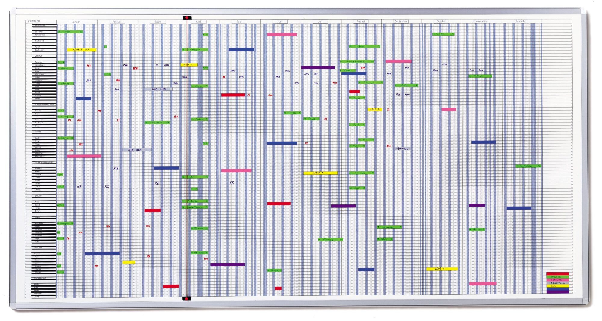• Franken Premiumline Operational Annual Planning Whiteboard 193 x 100 cm (WxH) • Magnetic surface with silver anodised aluminium frame • A perpetual year planner with 90 positions • Suitable for multiple purposes, including production planning • Includes 90 magnetic name plates (10 x 80 mm), magnetic month plates, 8 coloured magnetic strips (10 mm), transparent adhesive tape for marking weekends and public holidays, date indicator, 1 wetwipe FineMarker and 1 drywipe BoardMarker • Only FRANKEN planners offer this clever overview for staff and schedule planning, due to the ingenious system of a printed calendar in every line and continuous line numbering • Day grid size: 4.5 x 10 mm • The magnetic surface allows the use of coloured magnetic strips and other magnetic accessories for highlighting your notes, tasks and plans • The lacquered steel surface is recommended for regular use and drywipes easily • Occasional use of cleaners is recommended for top performance • Planning boards are eco-friendly as they can be used, again and again!