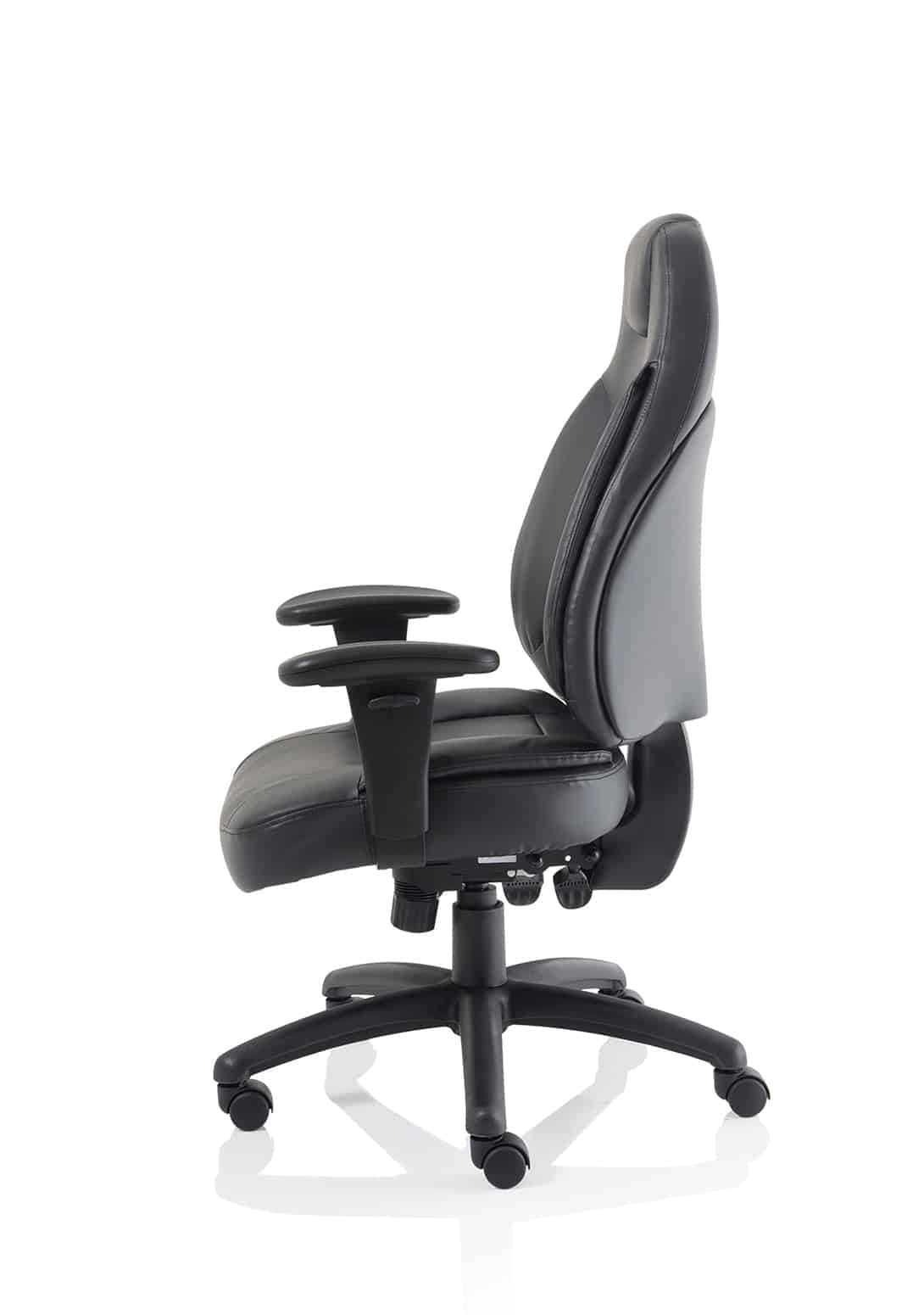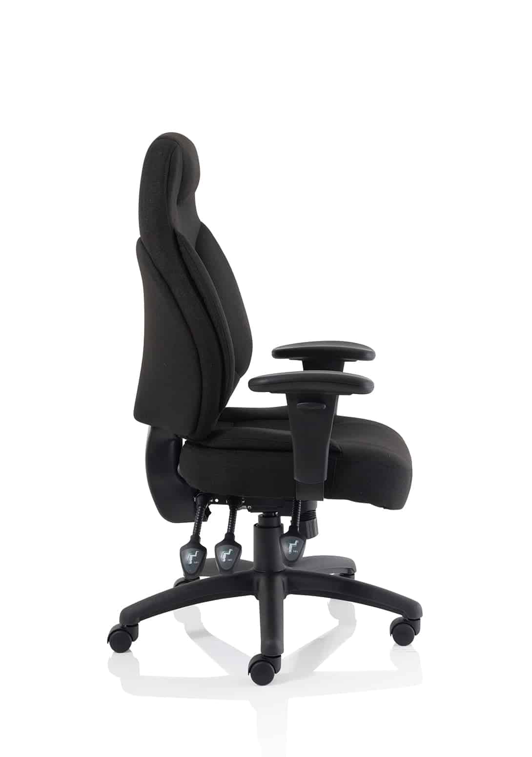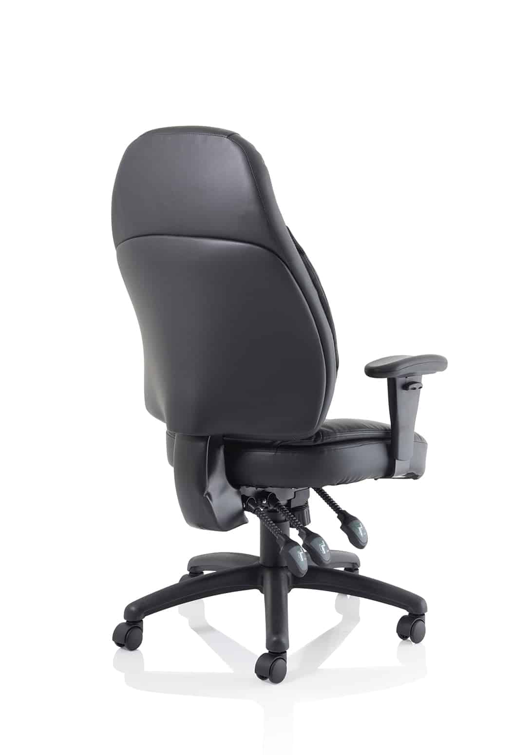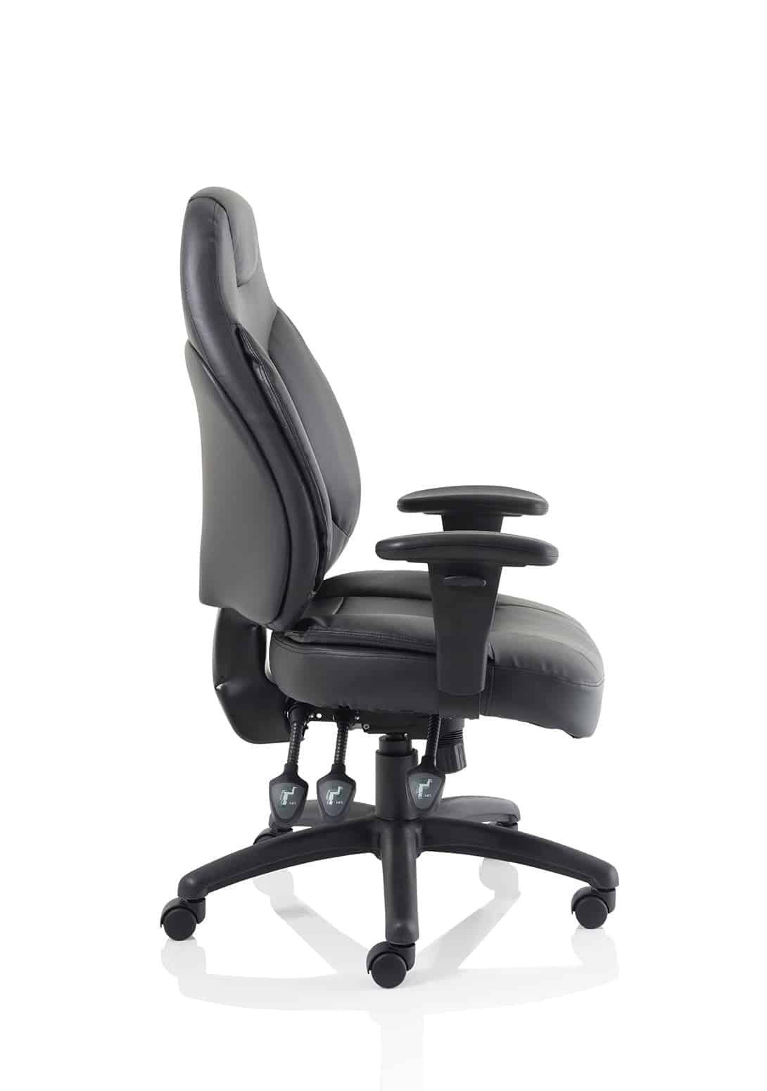 • Available in leather, black or blue fabric • Ergonomic seat and back promote good posture for all day comfort • Triple lever independent seat and backrest tilt mechanism • Ratchet height adjustable backrest • Height adjustable arms • Removable arms • Weight tilt tension control