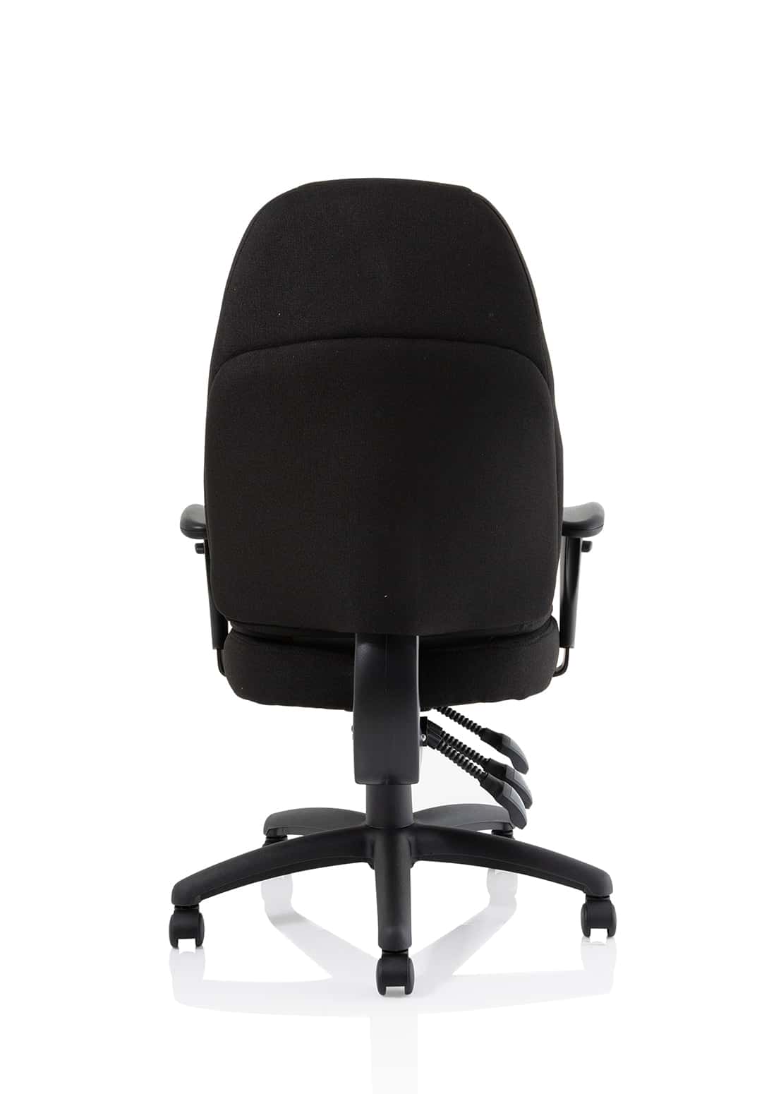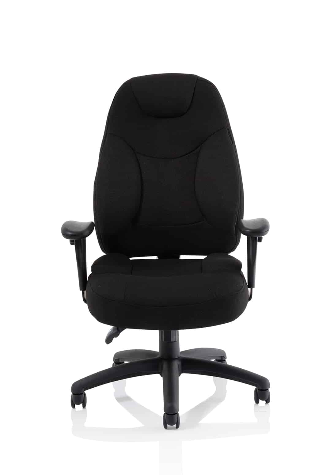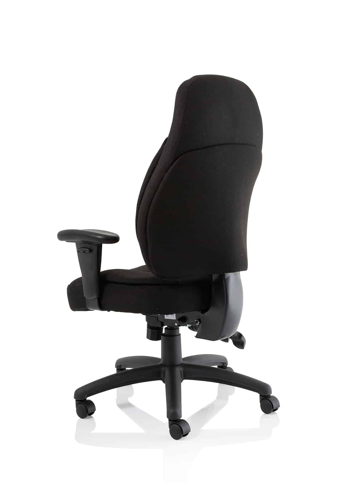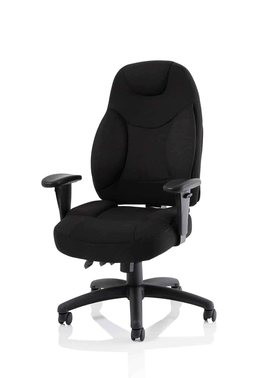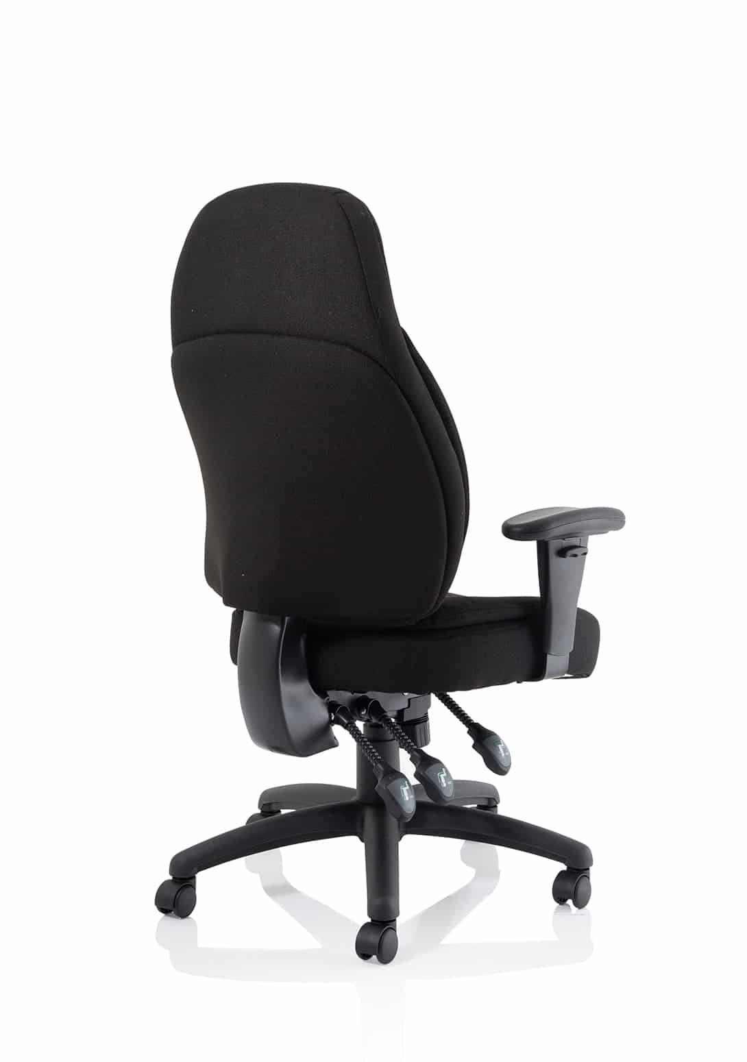 • Available in leather, black or blue fabric • Ergonomic seat and back promote good posture for all day comfort • Triple lever independent seat and backrest tilt mechanism • Ratchet height adjustable backrest • Height adjustable arms • Removable arms • Weight tilt tension control