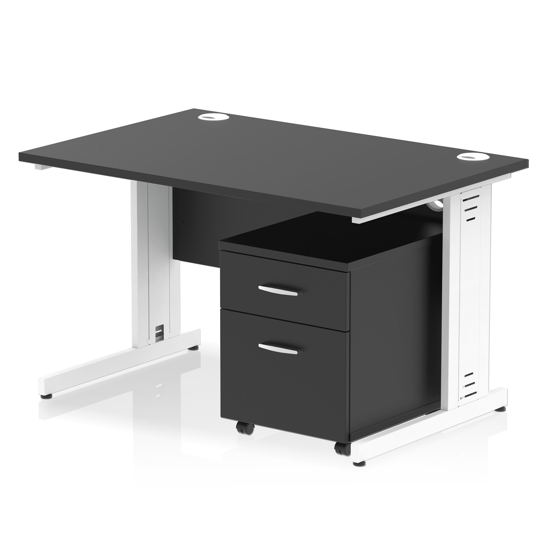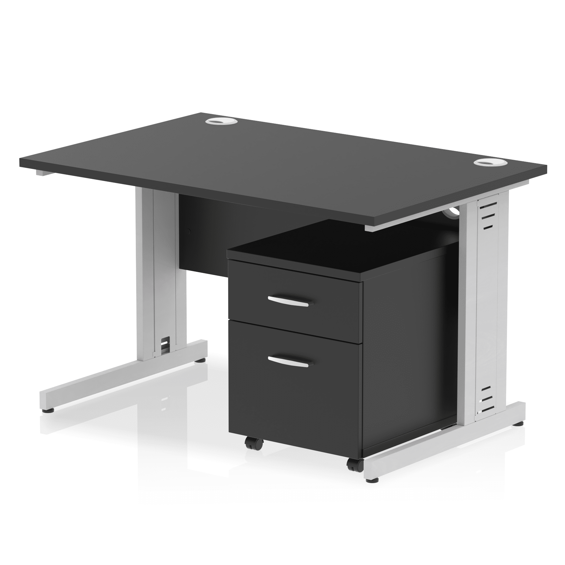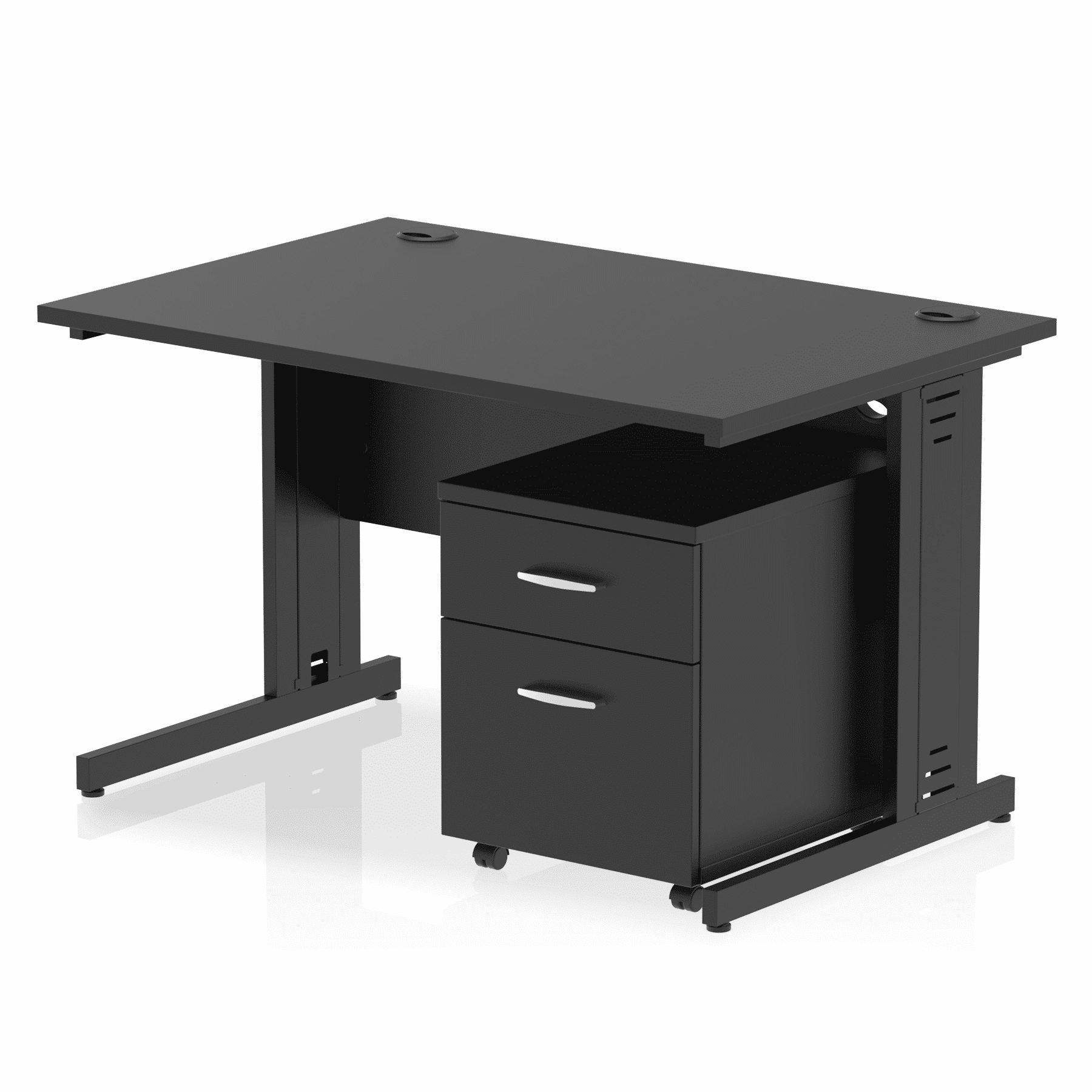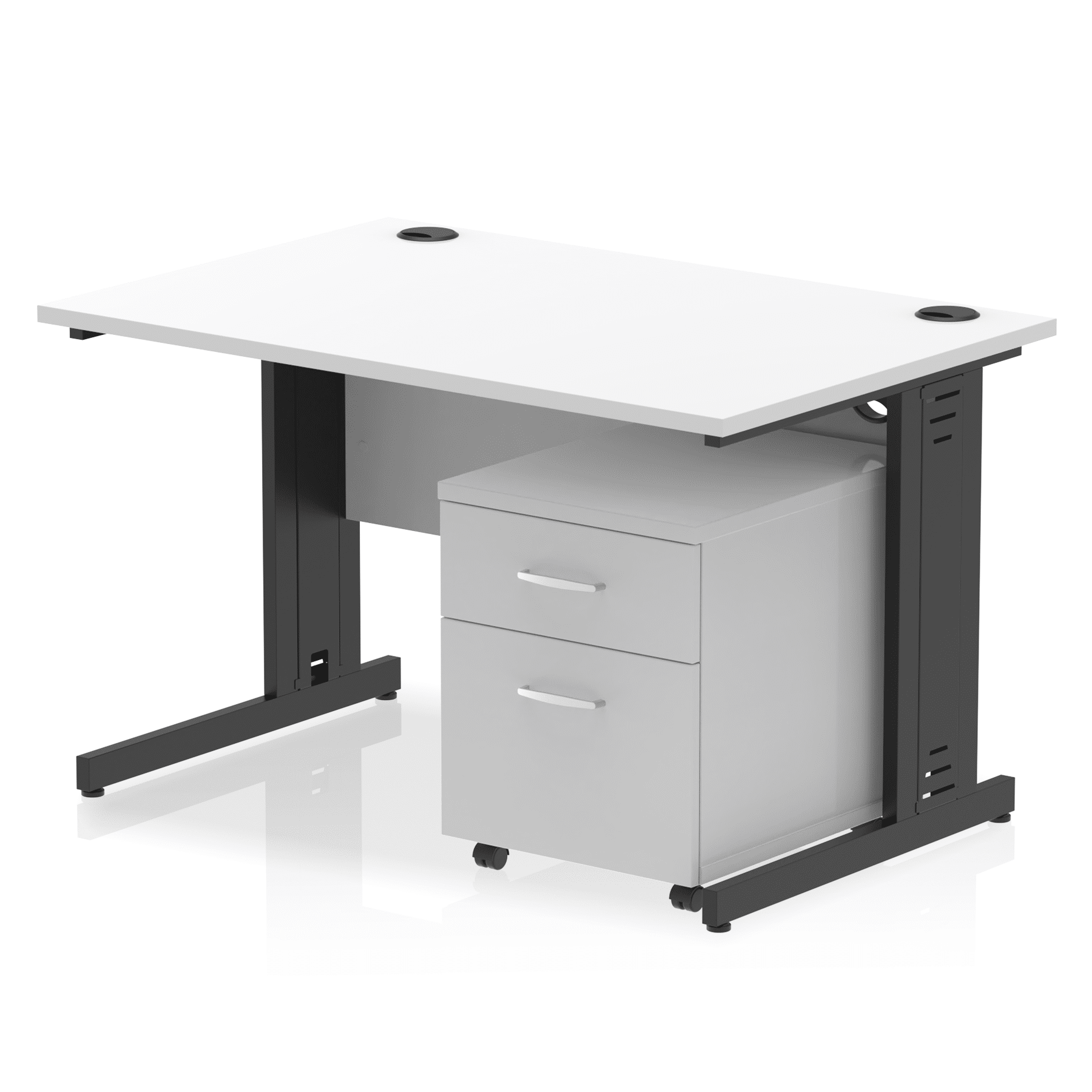 Impulse contract workstation | 25mm tops | Desk and pedestal combined | Heat resistant melamine finish | 18mm modesty panel | 2mm protective abs edging | Cable managed legs | Multiple cable ports | Height adjustable feet | Steel to steel fixings | Modesty panel slots wire slots | Deep set modesty panel (5″) allows for compatibility of most screen clamp fittings