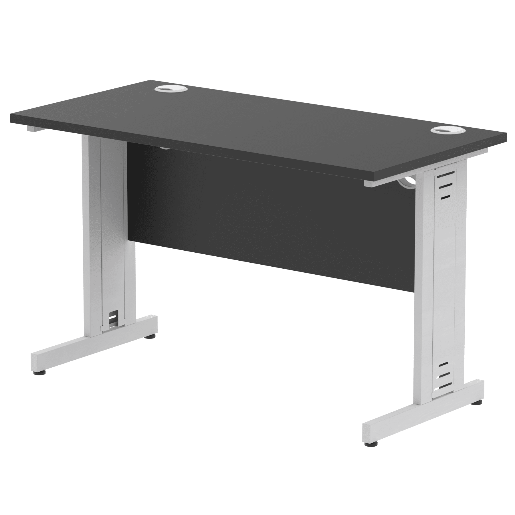 Impulse contract desk | 25mm tops | Heat resistant melamine finish | 18mm modesty panels | 2mm protective abs edging | Cable managed legs | 2 cable ports | Height adjustable feet | Steel to steel fixings | 2 modesty panels slots| Deep set modesty panel (5″) allows for compatibility of most screen clamp fittings | Weight Capacity 135Kg