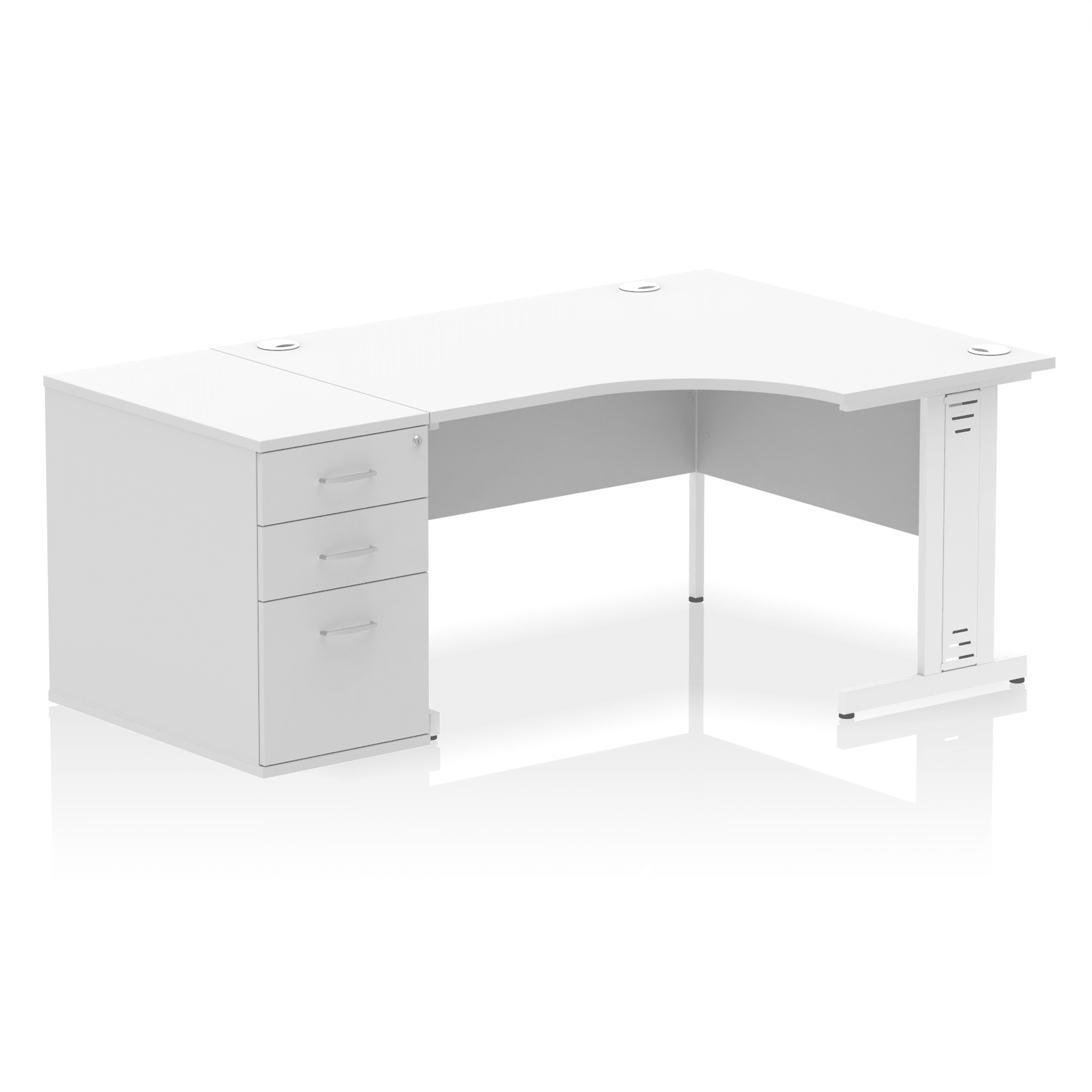 • Impulse contract workstation • 25mm tops • Desk and pedestal combined • Heat resistant melamine finish • 18mm modesty panel • 2mm protective abs edging • Double strut legs • Multiple cable ports • Height adjustable feet • Steel to steel fixings • Modesty panel slots wire slots • Deep set modesty panel (5″) allows for compatibility of most screen clamp fittings