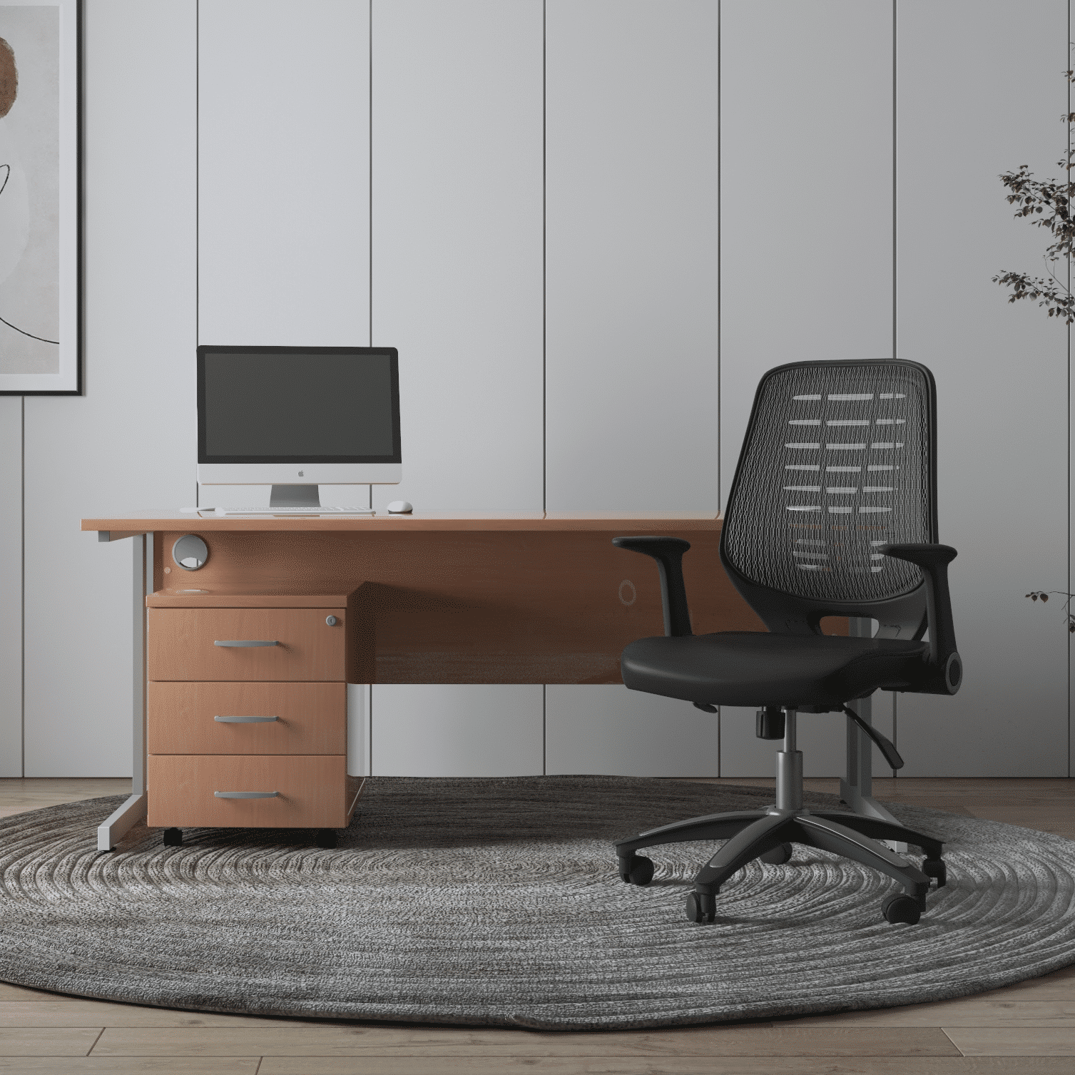 Impulse contract desk | 25mm tops | Heat resistant melamine finish | 18mm modesty panel | Double strut legs | Steel to steel fixings | Impulse mobile pedestal | Steel handles | Smooth running castors for mobility | Lockable drawers | Solid drawer construction | Relay operator chair | Airmesh fabric seat cushion | Soft mesh backrest with stylish design | 2 lever infinite lock tilt mechanism | Weight tension controlled | Fold back boomerang arms | Gas lift tested to 110kg | Usage: 8 hours