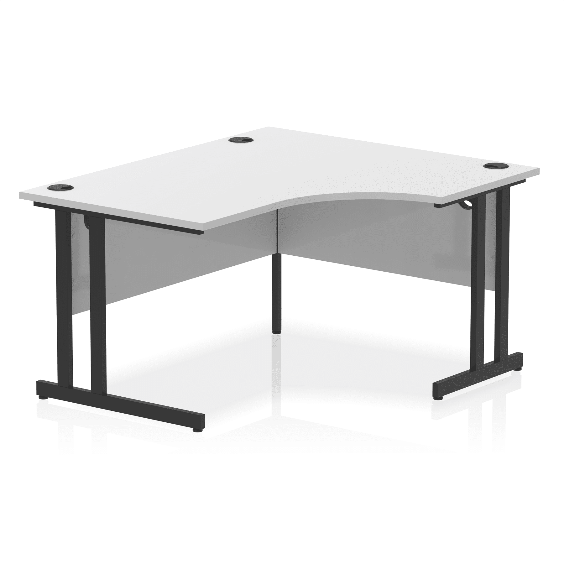 Impulse contract 1400 wide crescent desk | 25mm tops | Heat resistant beech melamine finish | 18mm modesty panels | 2mm protective abs edging | Silver coated double strut legs | 3 cable ports | Height adjustable feet | Steel to steel fixings | 3 modesty panels slots | 600 deep | Deep set modesty panel (5″) allows for compatibility of most screen clamp fittings | Weight Capacity 135Kg