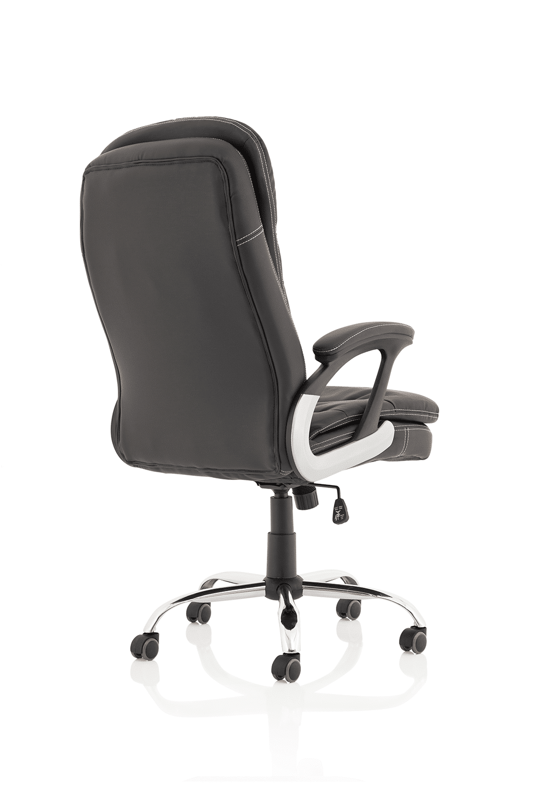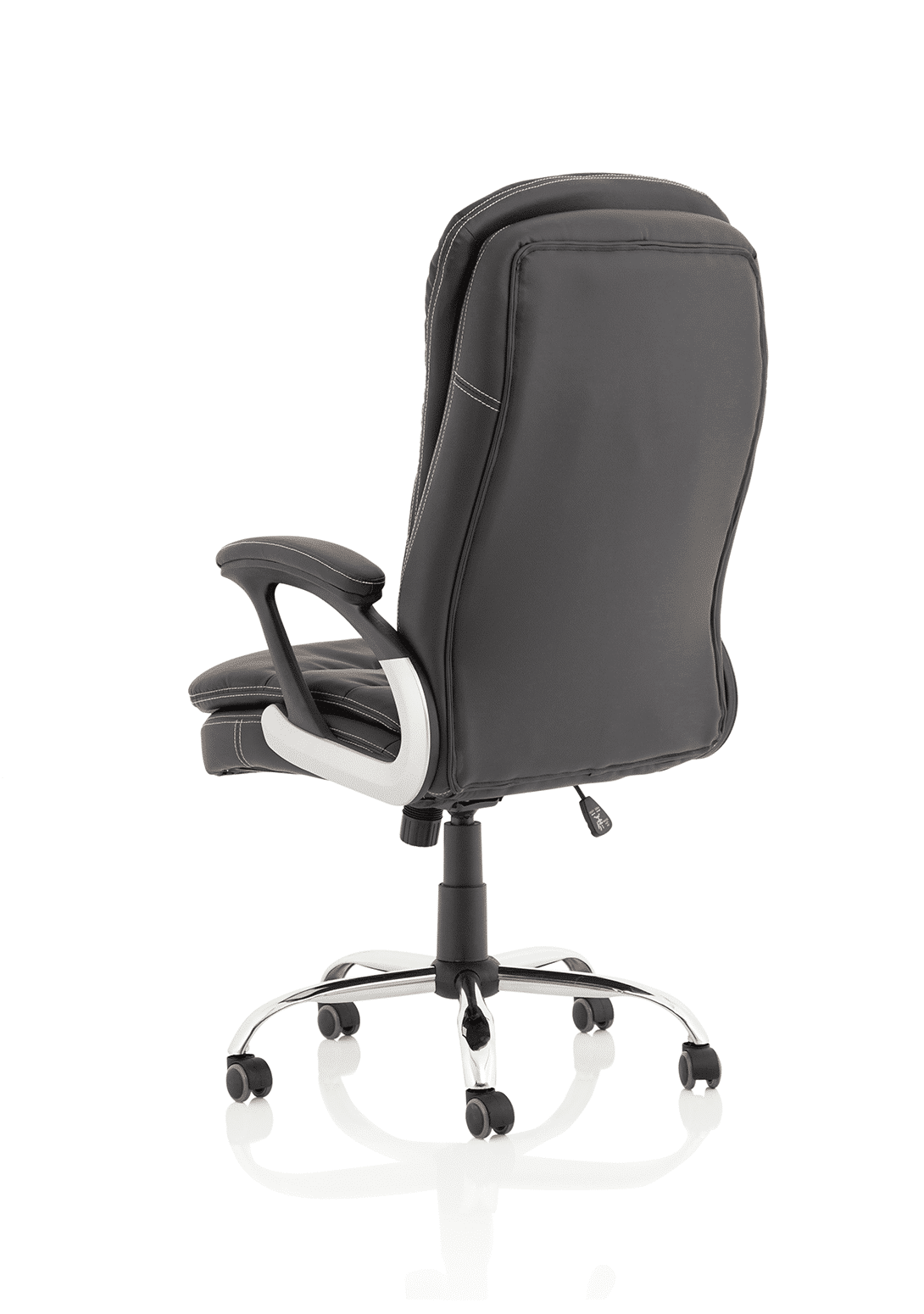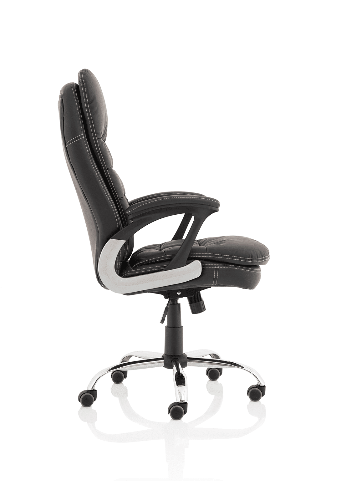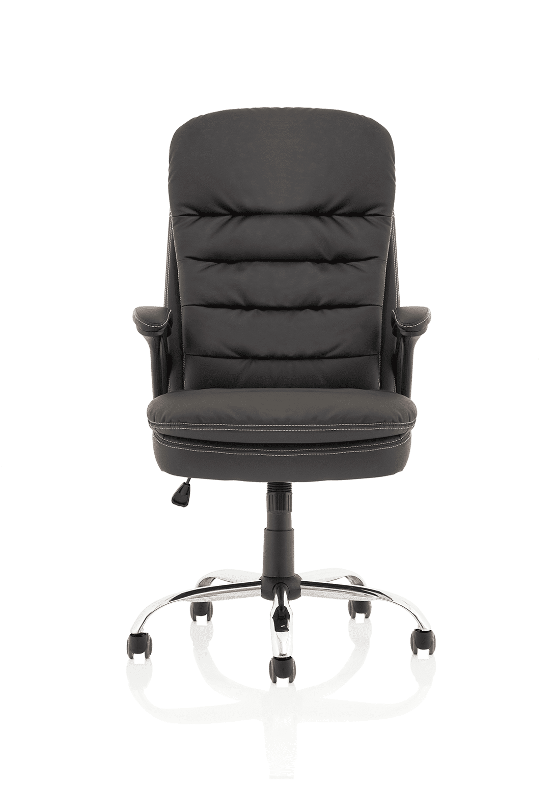 This ingeniously designed chair with detail stitching, integral lumbar support, auto-tilting action and fully upholstered arms is everything the modern executive craves from their seating solution. A chair for every user and every location it has upholstered pads for extra comfort and stunning good looks for the modern office. This highly functional exec chair is finished in wipe clean leather look upholstery that is soft to touch.