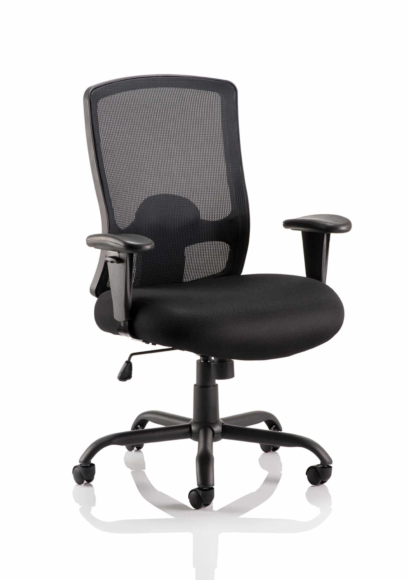 • Robust frame large seat and back make this chair suitable for heavy duty use • Generously portioned seating dimensions will accommodate most users • High density soft moulded airmesh seat • Large contoured mesh backrest • Single lever lock tilt mechanism • Weight tilt tension control • Height adjustable lumbar support • Height adjustable padded arms • Removable arms