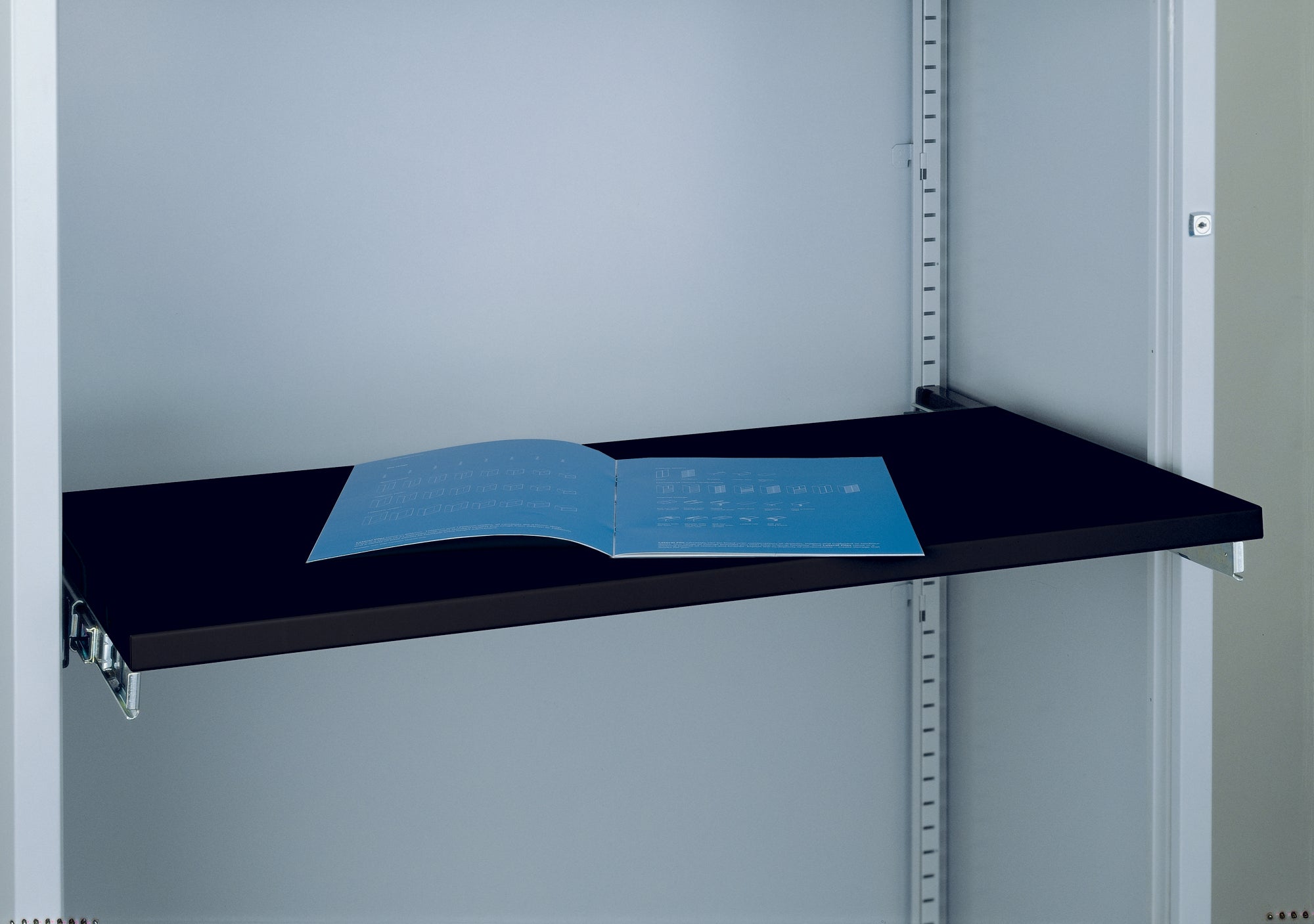 Neat, pull out, and push back shelf for reviewing filing whilst in situ | Silent glide runners | Shelf option only recommended to be used in the bottom half of the unit only