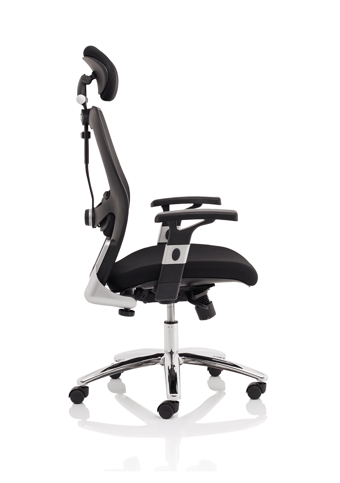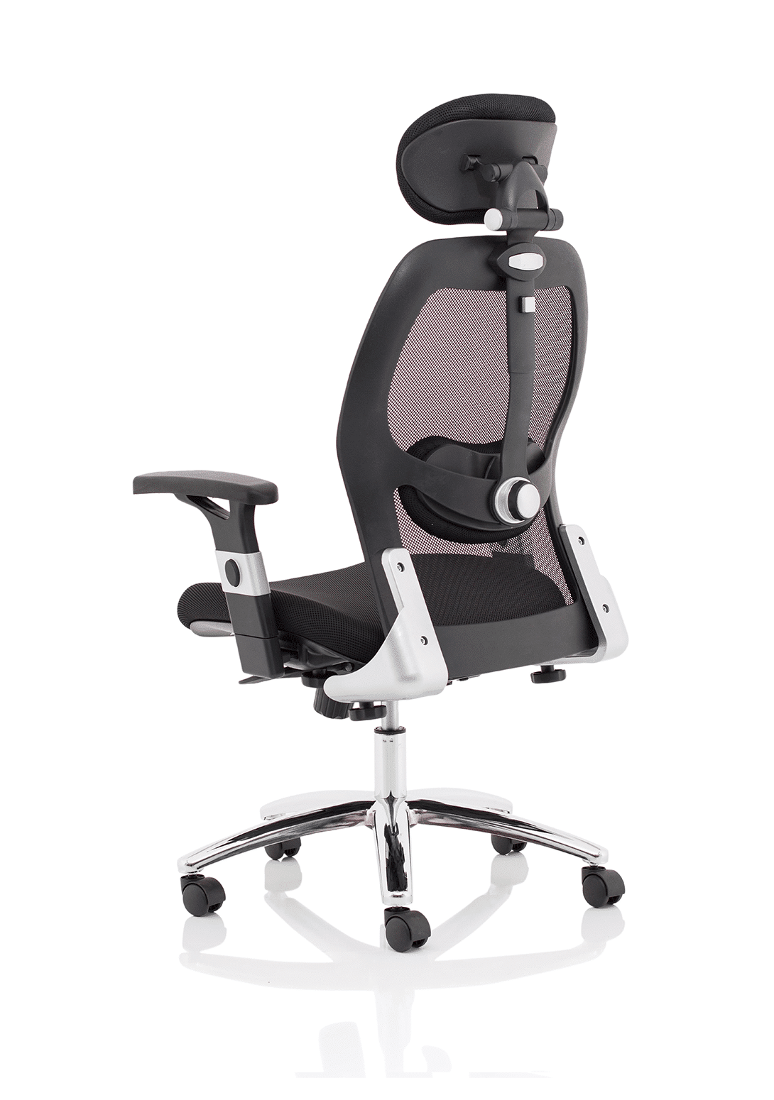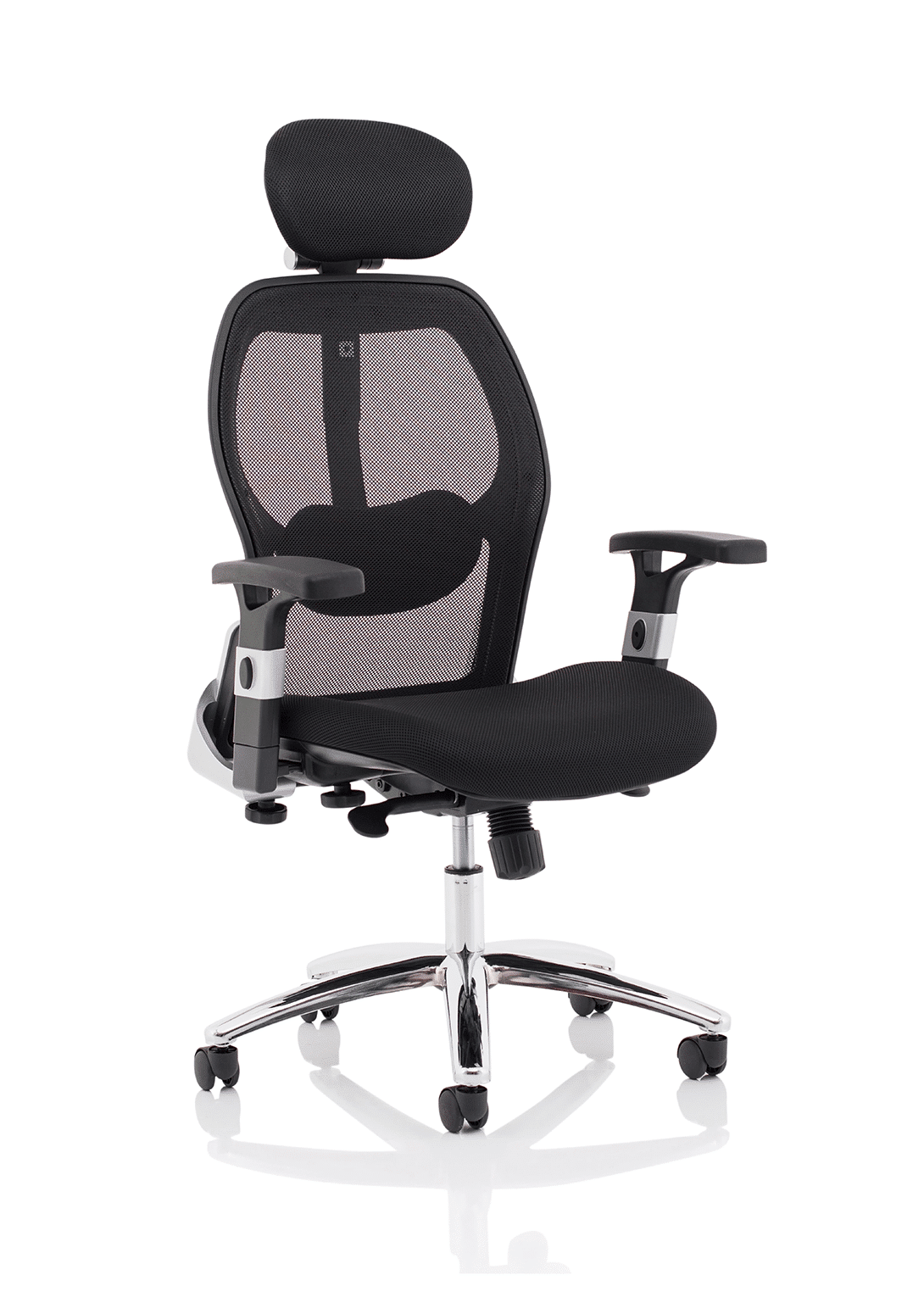 • Contoured airmesh fabric seat • Mesh back with adjustable lumbar pad • Twin lever mechanism offers gas lift and tilt adjustment with tilt tension adjustment • Height adjusting arms • Adjustable airmesh headrest • Chrome 5 star base