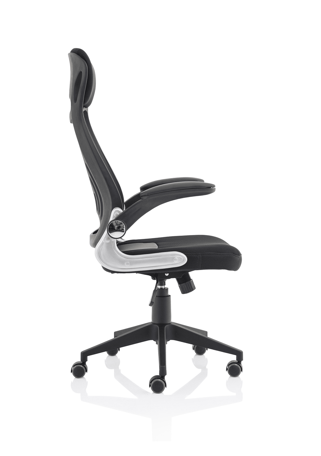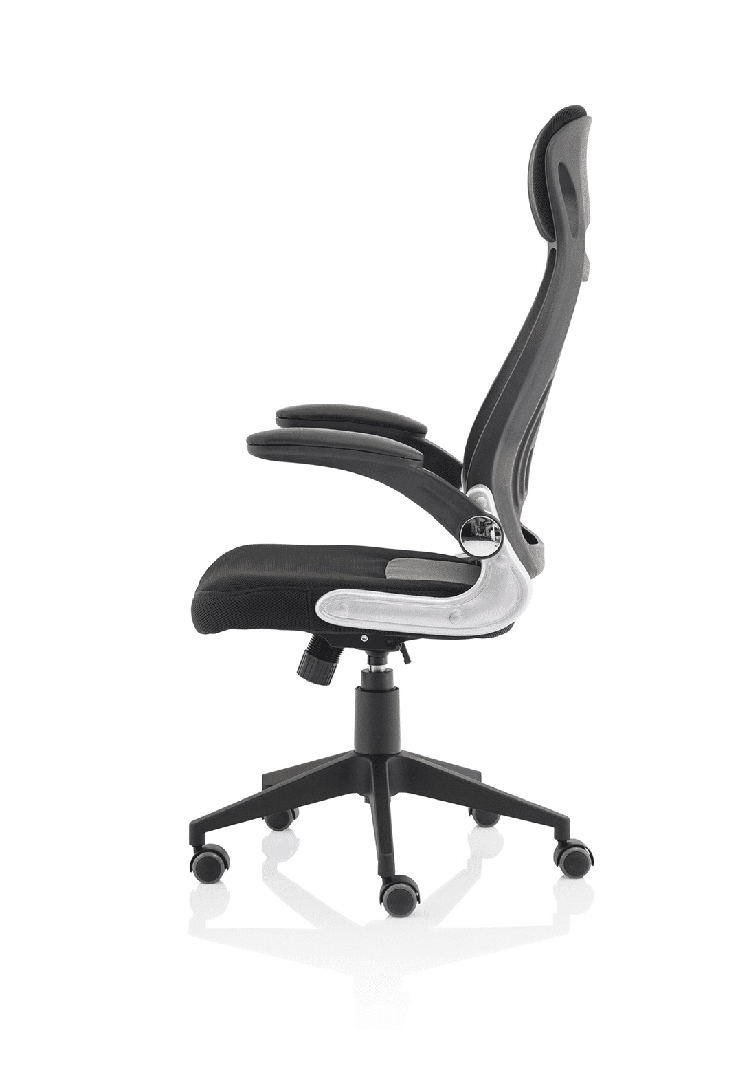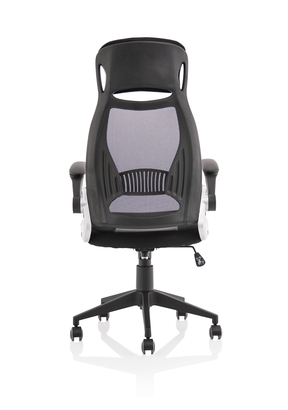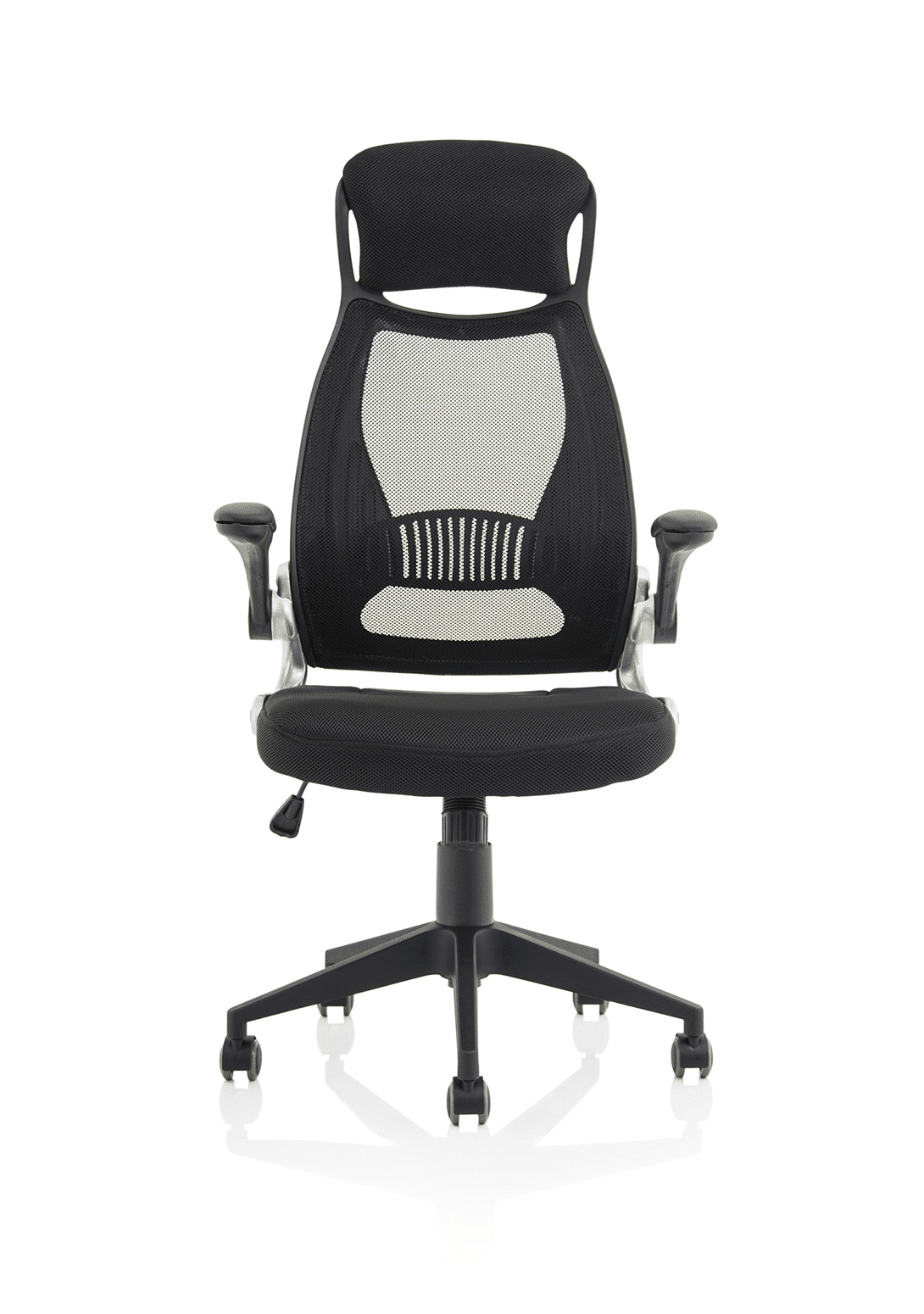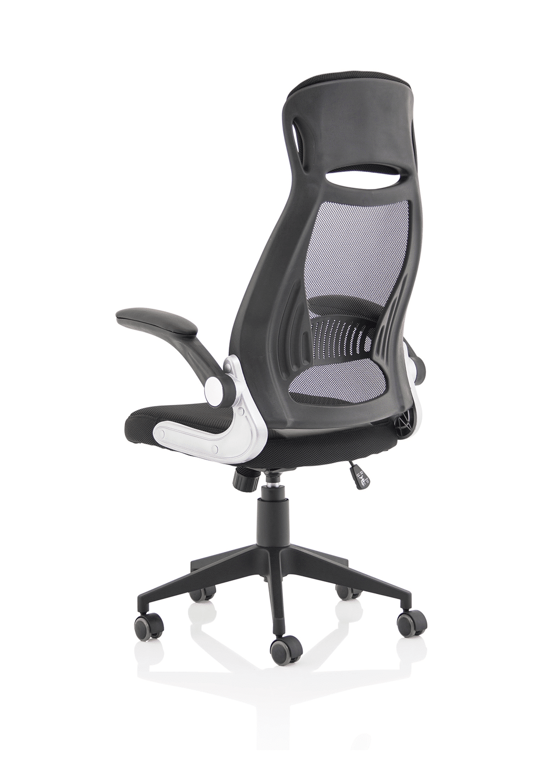 • Striking mesh back, airmesh seat design • Single lever rock and lock mechanism • Flip back arms for closer at desk work • Lumbar support pressure pad • Tension controlled tilt • Pyramid base • Generous airmesh headrest • Silver accented armature styling • Padded armrests