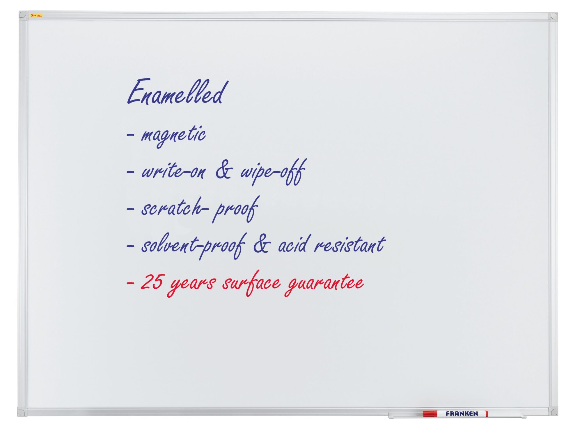 • Franken Valueline Whiteboard • Sizes: 150 x 100cm, 200 x 100cm or 300 x 120cm • Perfect for training, conference, meeting rooms and schools • This sturdy whiteboard with 12mm anodised aluminium frame construction • Drywipes easily, even after a long period of use and can be assembled landscape or portrait to fit your needs • The surface is not only magnetic drywipe and scratch proof but it is also acid resistant and comes with a 25-year guarantee • The fixings are concealed through the corners for a sleek look • Marker tray and wall mounting kit is included • The office of the future is a multifunctional space of interaction that foments team work • Our whiteboards are great alternatives to promote it, providing an easier and cleaner way to stay organized